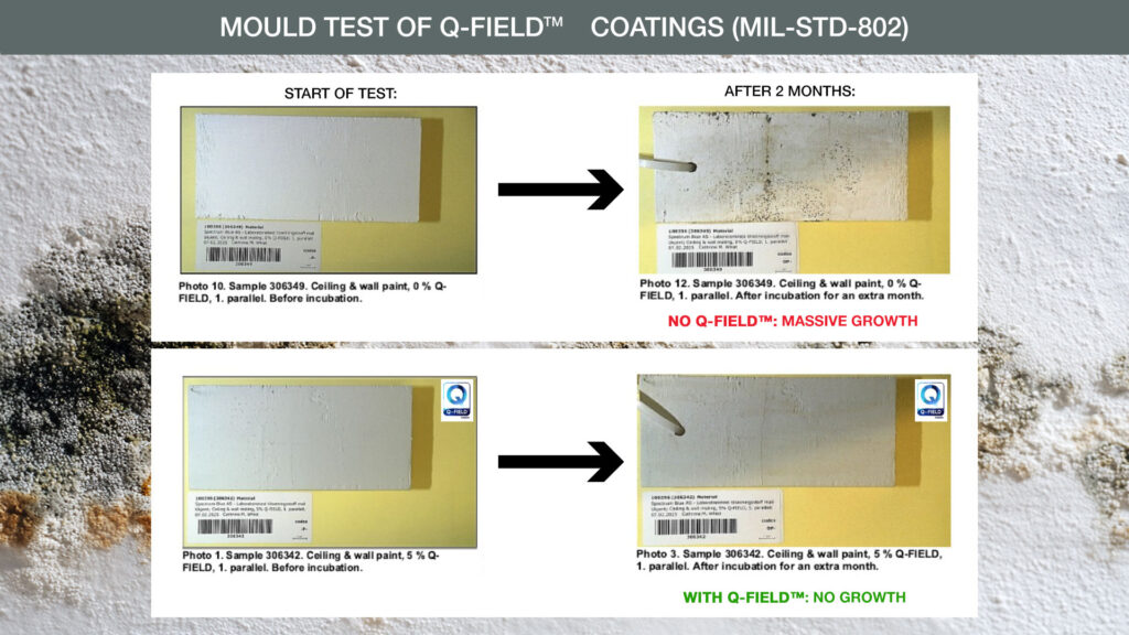 Q-FIELD™ er testet i kontrollerte laboratoriemiljøer for å dokumentere effekt på bakterier og muggsopp på overflater. I testene påføres Q-FIELD™ på definerte flater, som deretter eksponeres for utvalgte mikroorganismer under standardiserte forhold. Resultatene måles over tid og sammenlignes med etablerte referanseverdier.